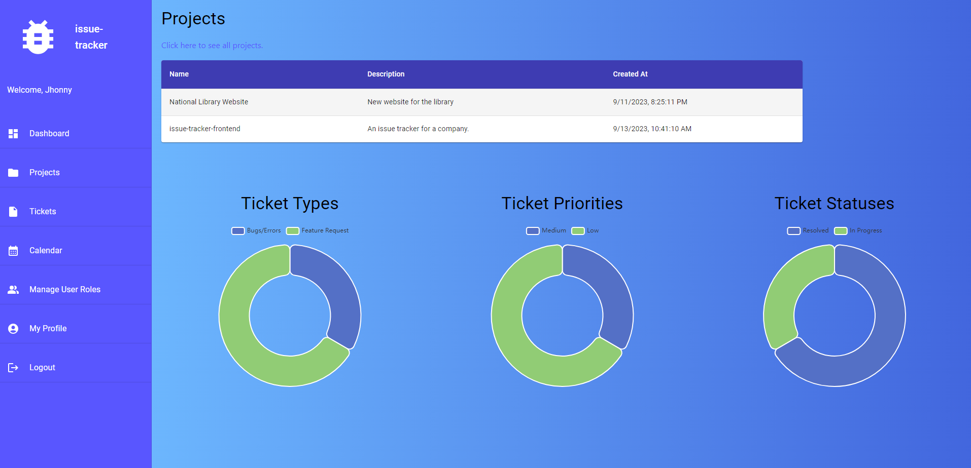 Bug Tracker tool (similar to Jira) for managing bugs in projects, feature requests and reporting bugs among diverse users, used React and Material UI. implemented security with Auth0 for authentication and JWT tokens, and server made with Node.js, with PostgreSQL and Sequelize ORM. Efficiently stored images using Firebase Storage. Strengthened skills in full-stack development and problem-solving.